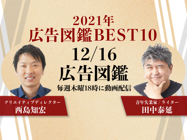 毎週木曜18時に動画を更新。田中泰延氏と西島知宏氏が、直近で話題となった様々な広告事例を紹介する番組「広告図鑑」。